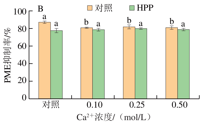 本研究围绕HPP协同温度处理下微环境因素对柑橘PME及其抑制剂(PMEI)结构与功能的调控机制展开系统探讨。结果表明,Ca2+在常温HPP(600 MPa/25 ℃)条件下即可实现PME活性的完全抑制,而在果胶体积分数为0.01%~3%条件下,PME活性不稳定,高浓度则可能引发体系过黏稠,限制其应用。在pH 7.0条件下,HPP/60 ℃处理可显著降低PME活性(抑制率>95%),并诱导其发生