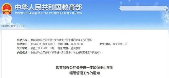 2021年4月,教育部办公厅发布《关于进一步加强中小学生睡眠管理工作的通知》,提出小学上午上课时间一般不早于8:20,中学一般不早于8:00。