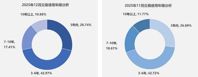 12月,二手车使用年限在3-6年的交易占比最多,占42.97%,环比增长0.25%,较去年同期下降7.47%;使用年限在3年内车型占28.74%,环比增长1.85%,较去年同期增长2.25%;车龄在7-10年的车型占17.41%,环比下降1.2%,较去年同期增长1.66%;车龄10年以上的车型占比为10.88%,环比下降0.89%,较去年同期增长3.56%。