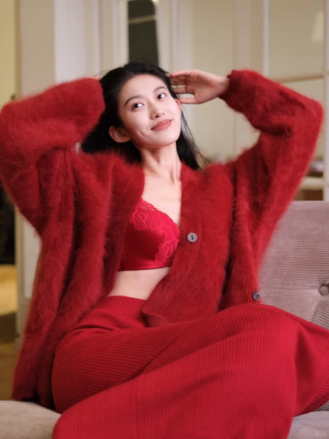 颜色也不是那种俗气的亮红色,而是高级又复古的波尔多斯红,温暖又自然,衬得肤色特别白皙。