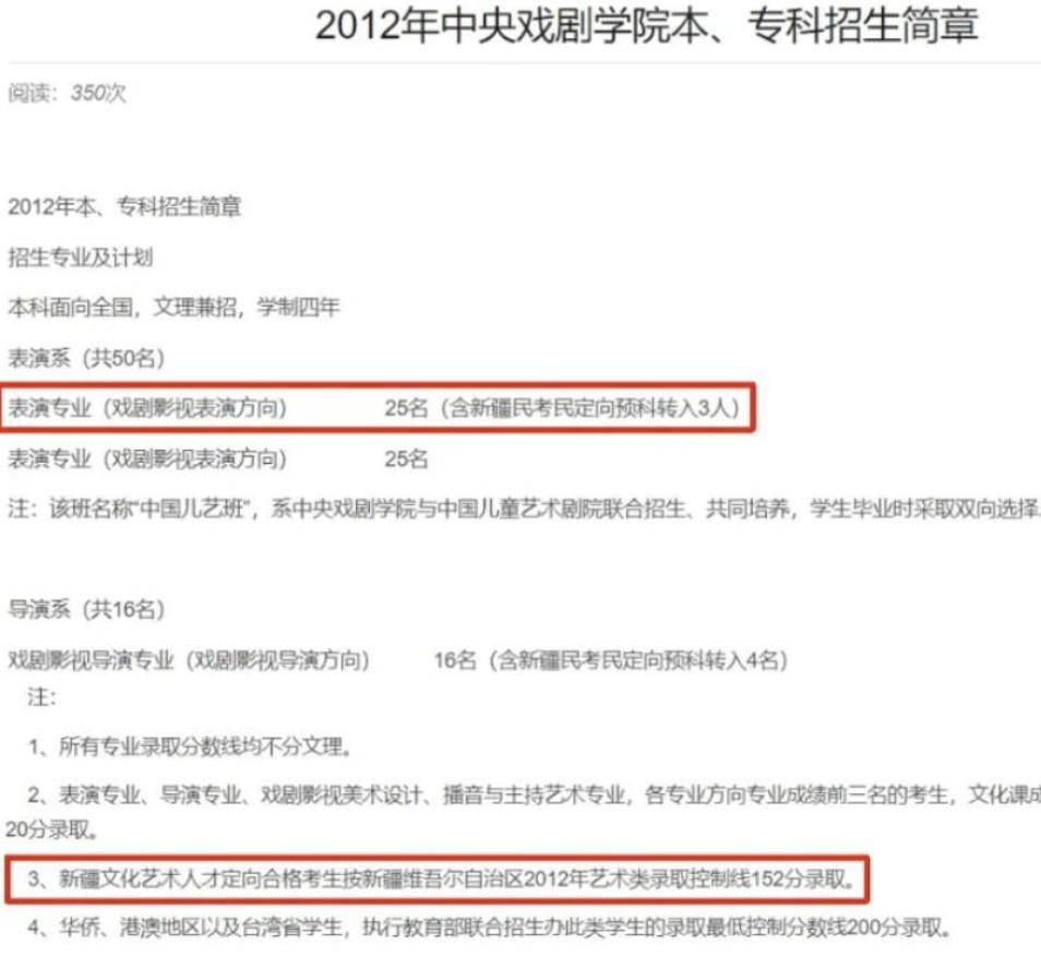 在贴出的旧闻截图里,可以清晰地看到“中央戏剧学院”几个大字,出现在2012年新疆定向培养招生院校的名单里。