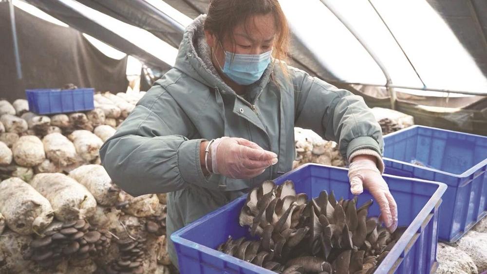 在李家疃镇菌菇种植基地,3500个标准化大棚整齐排列。为抵御低温寒潮侵袭,基地提前加固棚体骨架,给大棚覆盖上保温被与防风膜,部分棚内还配备了增温设备。棚外寒气袭人,棚内却温暖如春,饱满的平菇从菌棒上簇拥而出,农户们正忙着采摘、分拣、装筐,新鲜的菌菇经过快速打包后,将通过冷链物流发往京、沪市场。