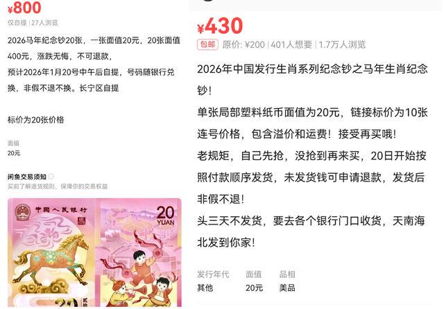 1月14日,贝壳财经记者从上海最大的邮票钱币市场——卢工邮币卡市场了解到,目前马年纪念钞、纪念币均是预约阶段,价格尚不确定,最终还是要看1月20日当天的情况。经销商黄力告诉贝壳财经记者:“2024年龙年纪念钞发行时,首日散张价格一度冲破100元,溢价近400%。有人连夜转卖,赚几千上万。但到了2025年底,龙钞价格已回落至76元左右。”