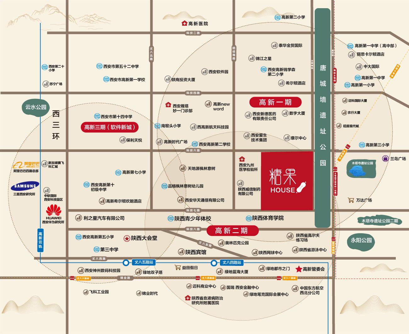 糖果soho处于沣惠南路与窑头东巷交汇处西南角,地处高新核心CBD区域,尽享核心区域配套红利。项目紧临唐城墙遗址公园,项目总占地约19多亩,共规划4栋公寓楼,社区周边商业、医疗、教育等生活配套资源醇熟,满足所有生活需求。