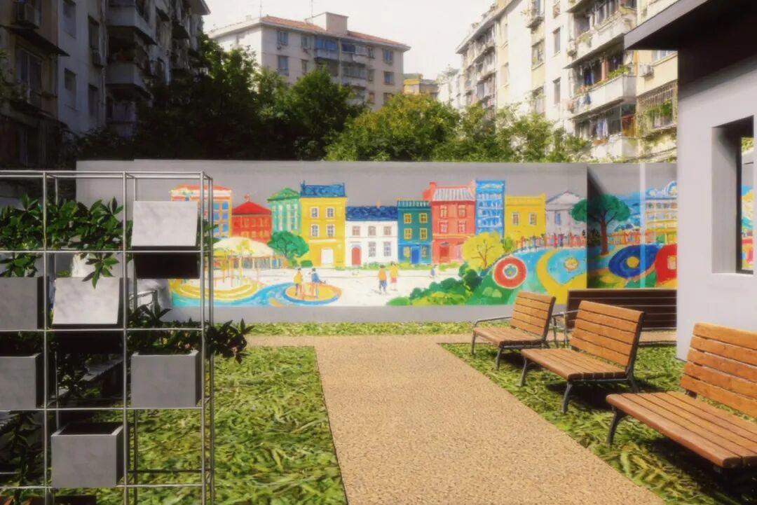 设计内容:江海四居廉听廊(党群微家)周边打造老幼共生的代际花园。