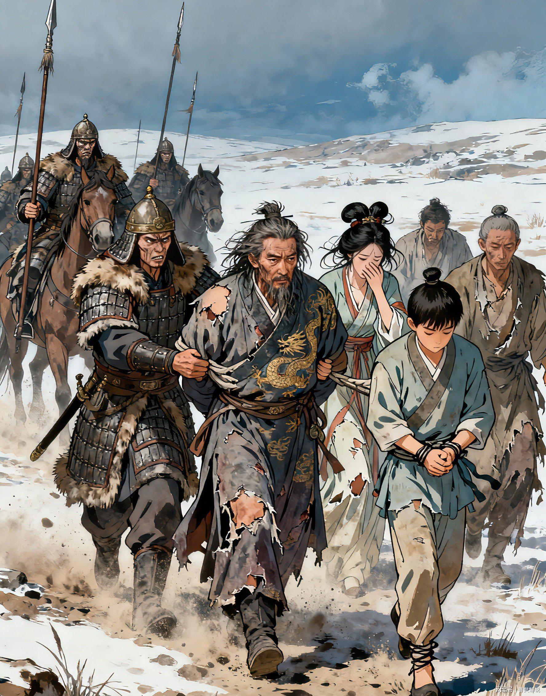 顶着寒风,顶着冰雪,顶着屈辱,徽钦二帝被剥去龙袍,着青衣侍酒,皇后妃嫔受尽凌辱,宗室大臣沦为奴隶。