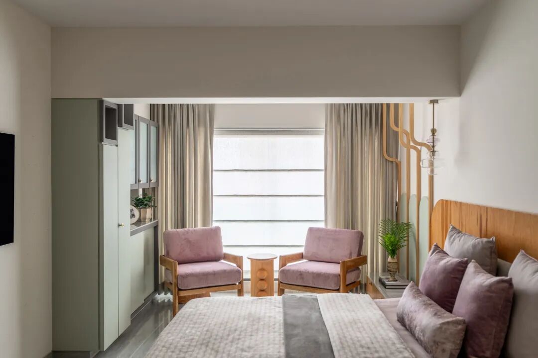 The social zone unfolds as a fluid blend of kitchen, dining, and living areas, redefined by structural reconfigurations that flood the space with natural light. A mirrored dining wall amplifies brightness, paired with sculptural lights from emerging Indian designers. The eclectic palette—pastel rusts, copper, peach, blue, and muted pinks—flows with controlled vibrancy, accented by an orange carpet and statement artworks. Italian-imported furniture harmonizes with bespoke pieces, while a fluted accent wall adds architectural depth without overwhelming the senses.