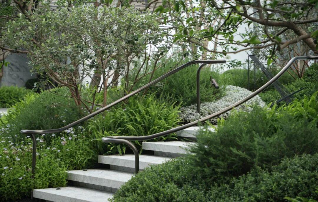 在浮岛花园中,我们特意将ART DECO风格的扶手进行抽象化、雕塑化的转译;保有功能的同时,也成为花园里的地景艺术品。轻攀精巧的扶手步入诗意静谧的花园,令人流连忘返于经典与自然的交融。
