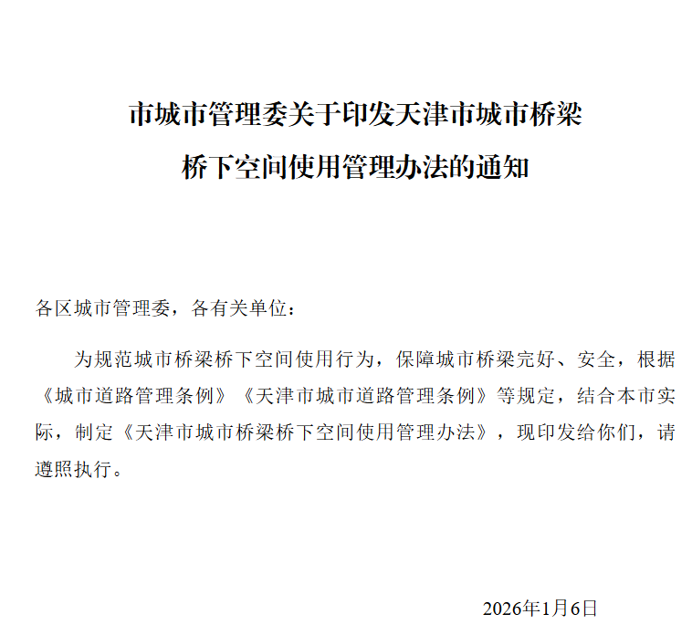 近日,天津市城市管理委印发通知,公布了《天津市城市桥梁桥下空间使用管理办法》,修订后的《办法》共15条,主要包括目的和依据、适用范围和概念、使用管理原则、职责、使用管理标准和要求、禁止行为、施行时间及有效期等。