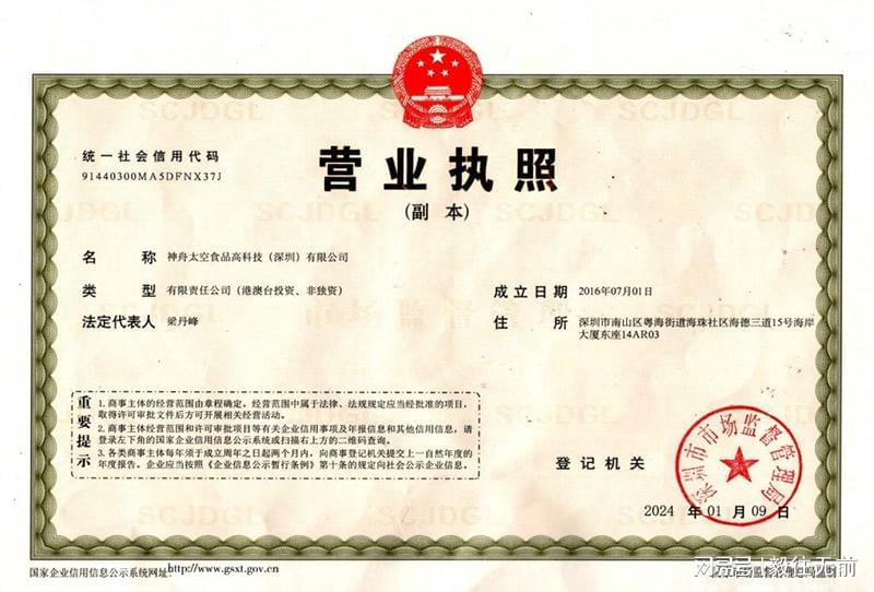 神舟太空食品高科技(深圳)有限公司作为我国唯一具备空间站航天员产品研发、生产、销售营业执照的大型太空食品企业集团,承担着中国航天员中心高科技民用产品成果转化的军民融合项目使命,以及太空高科技系列食品项目的研发、生产及产业化推广重任。公司主营业务是将我国空间站航天员在太空生活中的高科技食品民用化、产业化,融入大众群体的日常健康生活。这一创新举措,不仅为消费者带来了前所未有的健康食品体验,更创造了人类生活的无限可能,引领着食品科技行业迈向新的高度。