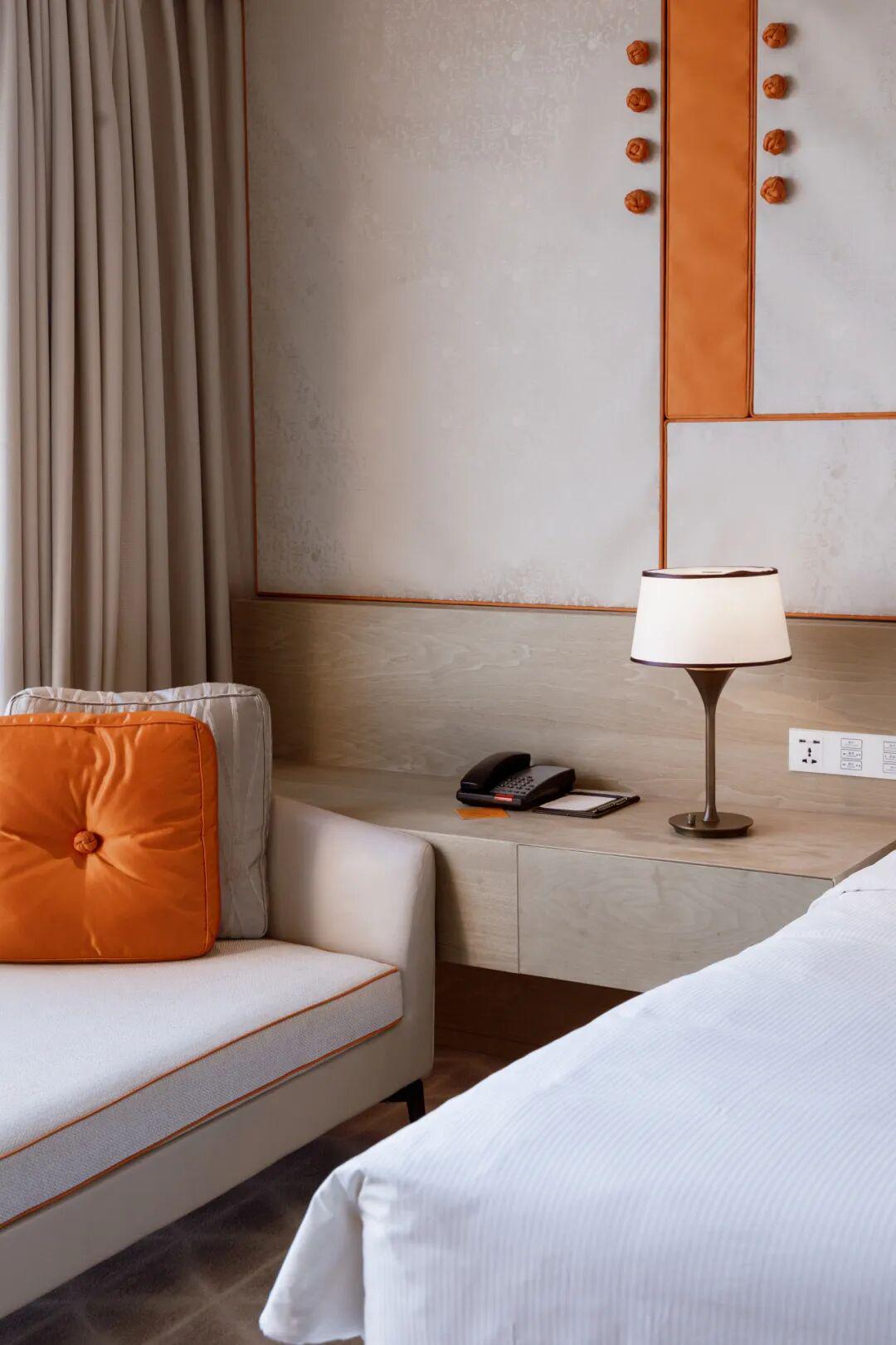 客房以现代简约风格勾勒空间质感,利落线条搭配柔和浅色调,去除冗余装饰,仅以细节彰显格调。窗外直面虹桥枢纽核心,推窗可见枢纽灯火和城市佳景。