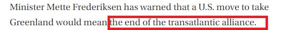 文章称,美国的欧洲盟友早已对其心有芥蒂,近期对于白宫执着于格陵兰岛一事更是公开地表达了不满。文章指出,德国总统施泰因迈尔日前就指责美国“价值观崩塌”,并敦促全世界不要让国际秩序沦为“强盗横行的丛林”,任由那些不择手段的人随心所欲地攫取利益。丹麦首相弗雷泽里克森则警告说,美国占领格陵兰岛将意味着跨大西洋联盟的终结。