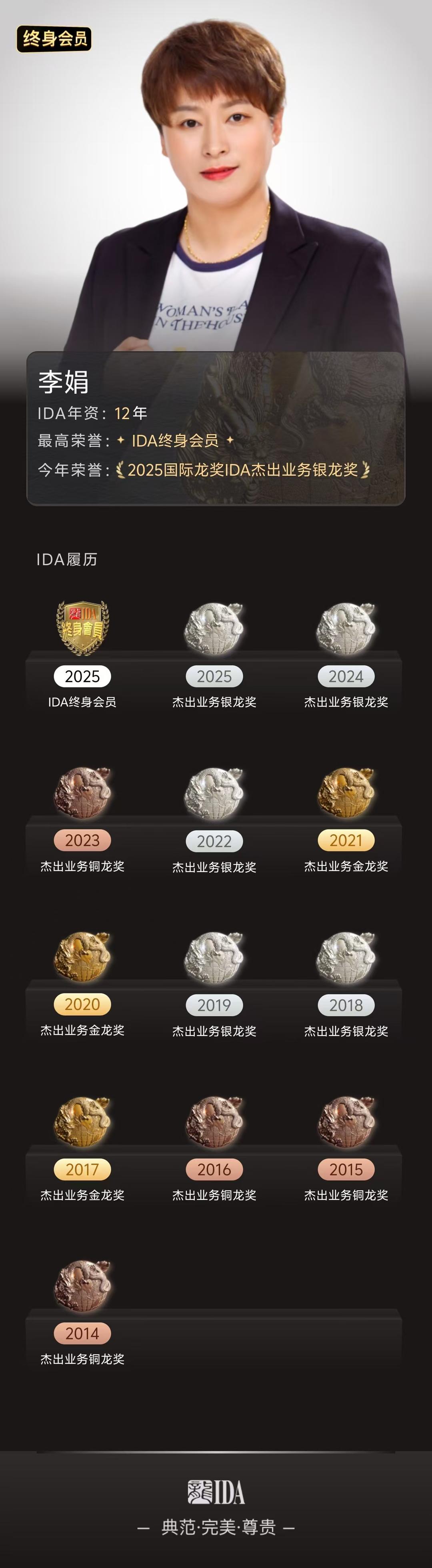 从连续十二年的IDA辉煌,到“终身会员”的终身荣誉;从“靠谱负责任”的口碑相传,到“专业服务好”的客户认证,李娟走过的路,是一条越走越宽、越走越亮的价值之路。