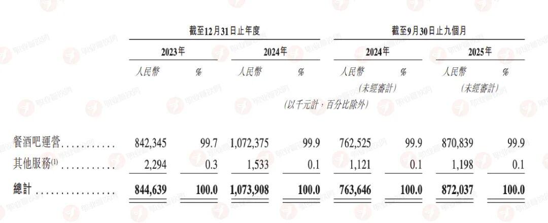 具体来看,截至2025年前三个季度,餐食贡献54%的营收,酒水饮料贡献约44.8%,其中85%为酒精饮品,成为绝对主力。