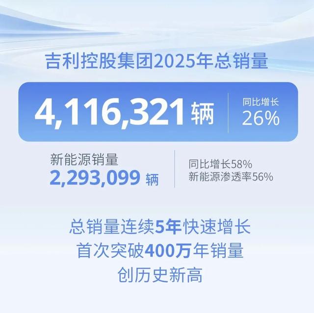 2025年,中国十大汽车集团合计销量超2840万辆,市场集中度约84%,10大车企中8家实现了销量增长,其中,增速最快的是吉利控股,年度销量首度超过400万辆,再创历史新高,同比增长26%,总销量连续5年快速增长。
