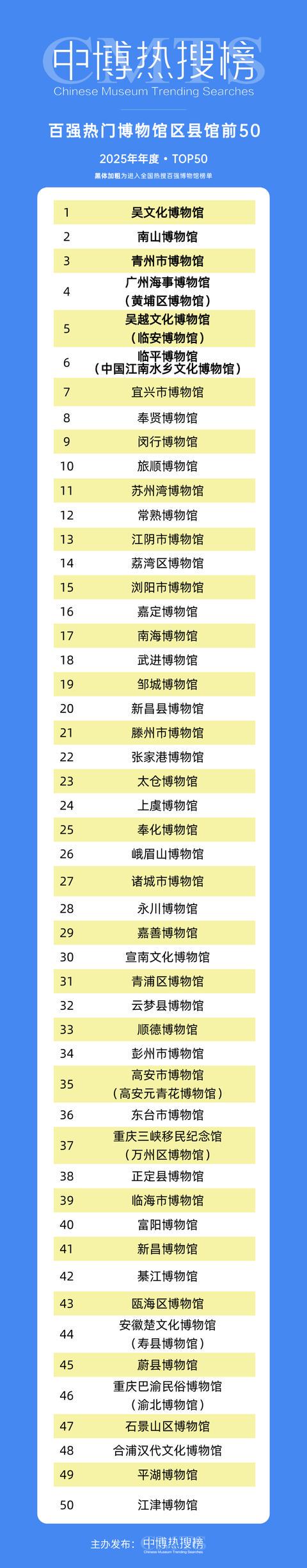 “百强热门博物馆区县馆前50”榜单。图片来源:博物馆头条