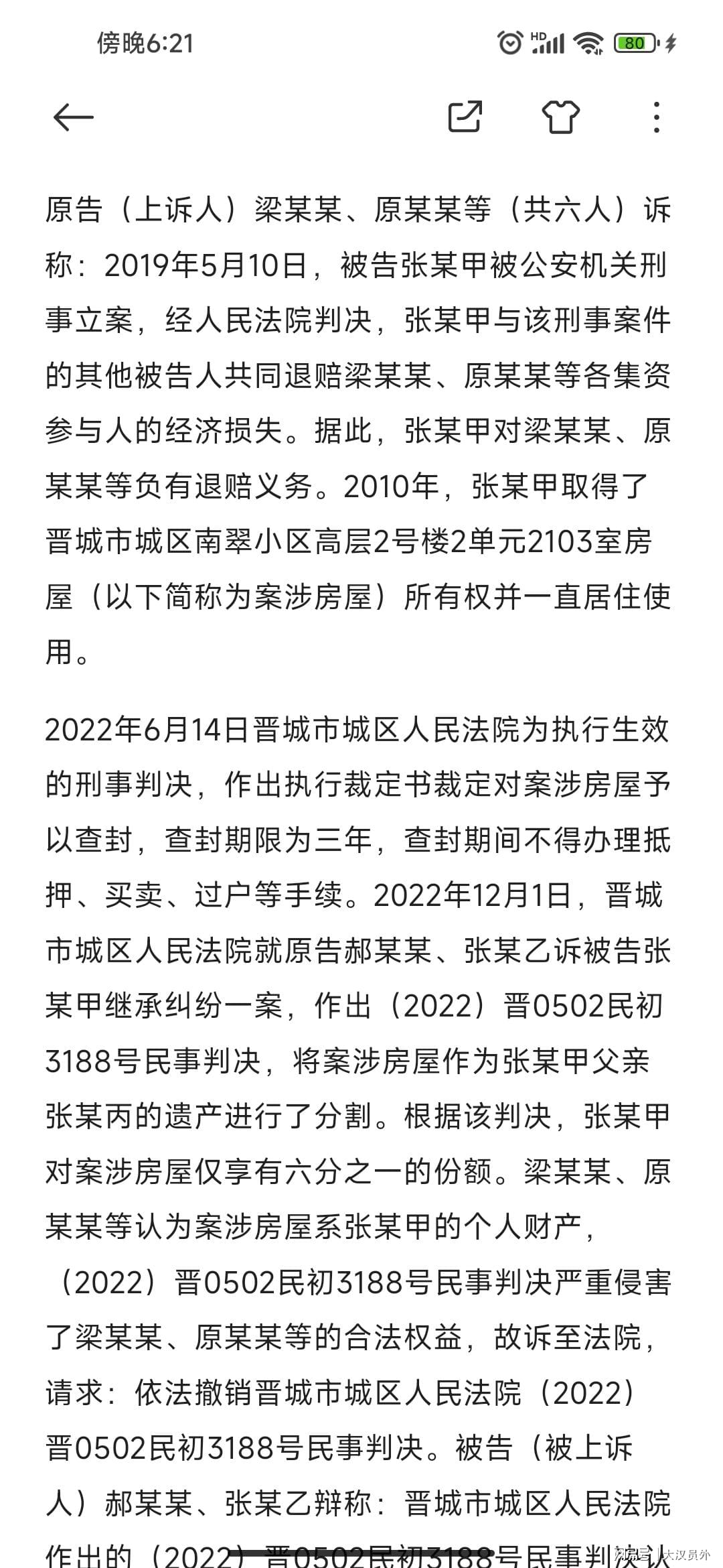 原告(上诉人)梁某某、原某某等(共六人)诉称:2019年5月10日,被告张某甲被公安机关刑事立案,经人民法院判决,张某甲与该刑事案件的其他被告人共同退赔梁某某、原某某等各集资参与人的经济损失。据此,张某甲对梁某某、原某某等负有退赔义务。2010年,张某甲取得了晋城市城区南翠小区高层2号楼2单元2103室房屋(以下简称为案涉房屋)所有权并一直居住使用。