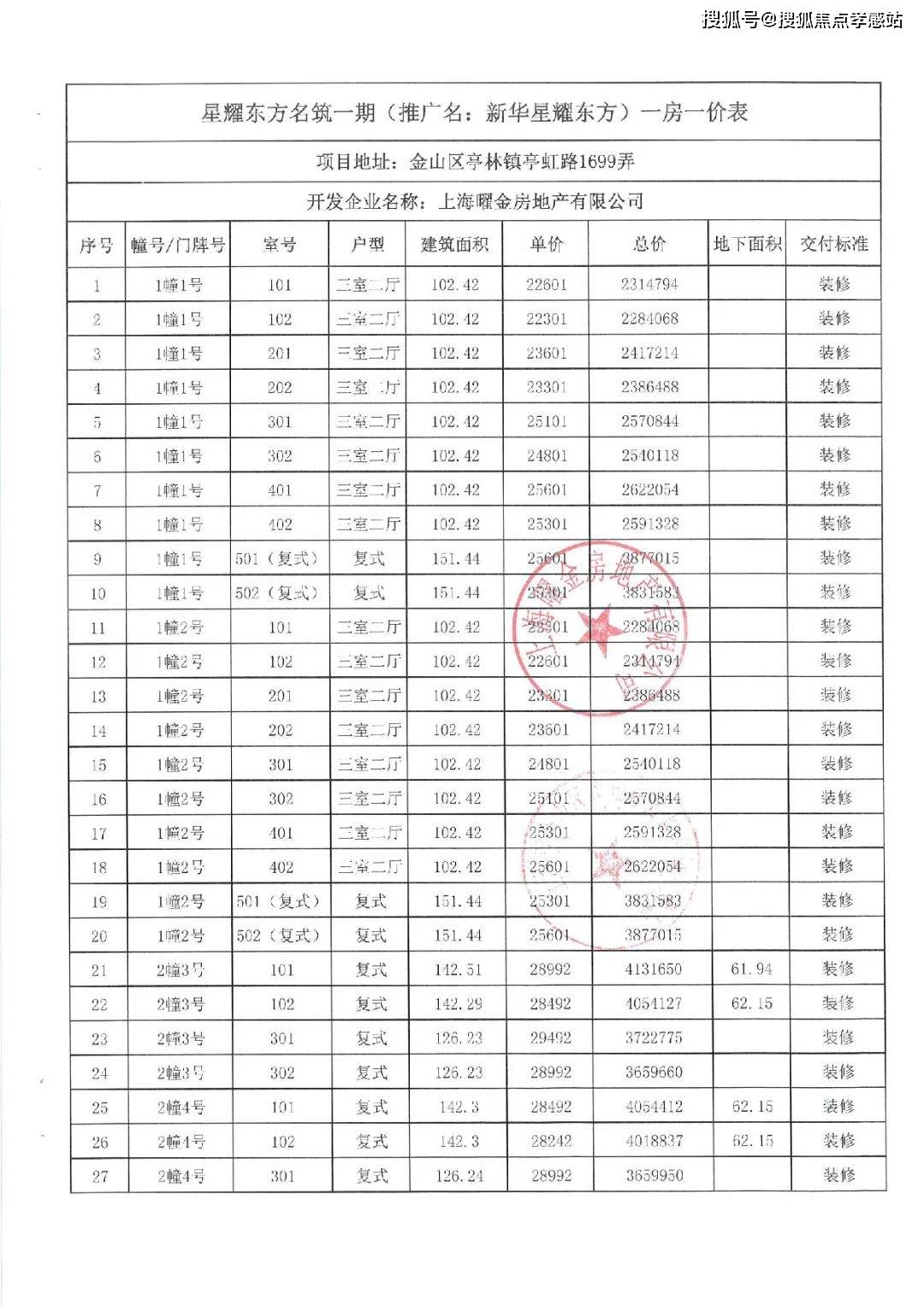 项目一房一价表