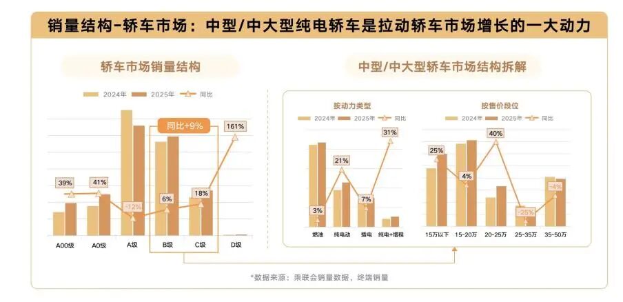 另一方面,B级与C级轿车市场在电动化与消费升级的双重推动下增长强劲,尤其在20-25万价区表现突出。该市场已从传统的燃油主导转向"纯电+插混"并行。
