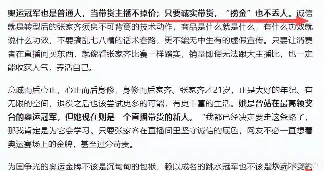 就在这份苛责与误解愈演愈烈之际,官媒终于挺身而出,为张家齐正名。官媒明确表态,运动员在赛场上凭实力为国争光,退役后选择带货谋生,只要坚守诚信底线,便半点不丢冠军的成色,更谈不上掉价。