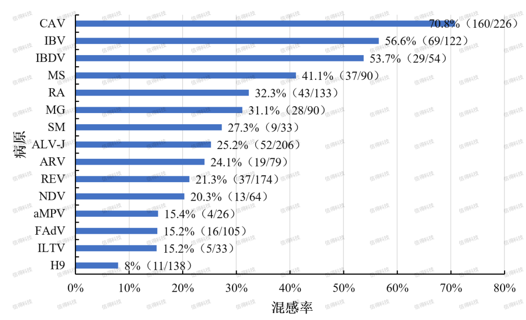 与IBV、IBDV、MS等主要病原混合感染率极高,构成“免疫抑制——继发感染”的恶性循环,严重威胁鸡群健康与生产效益。蛋鸡感染集中在6-30w(占比75.9%);CAV造成的免疫抑制会显著加重IBV对呼吸道的损伤,并延长病毒排毒时间;与IBDV、MDV的混感率均超过50%,与MS的混感率也达44.9%。这种协同作用会严重摧毁鸡群免疫系统,导致条件性致病菌感染和治疗难度大幅增加。