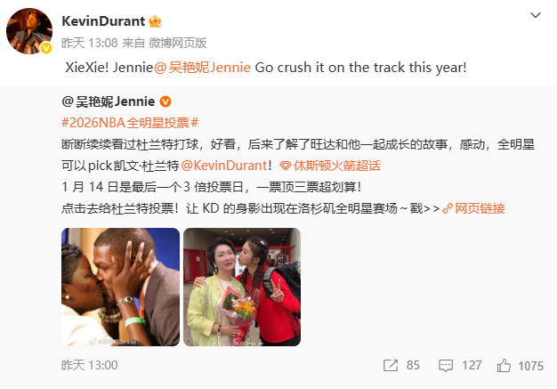 吴艳妮NBA全明星为杜兰特拉票,杜兰特回应:XieXie!