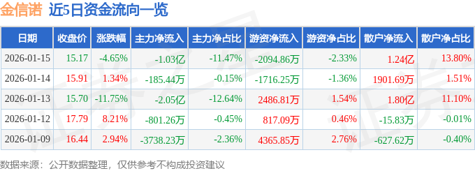 证券之星消息,截至2026年1月15日收盘,金信诺(300252)报收于15.17元,下跌4.65%,换手率10.6%,成交量59.22万手,成交额8.99亿元。
