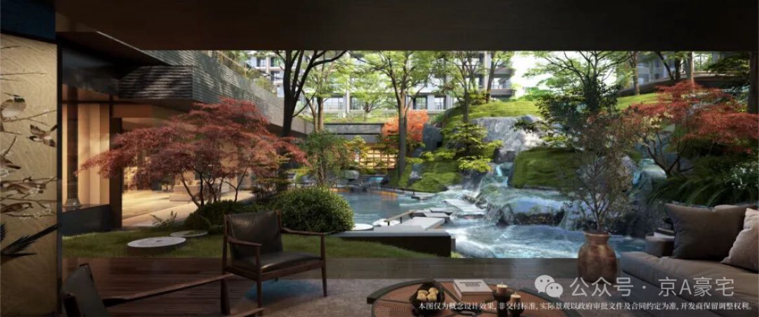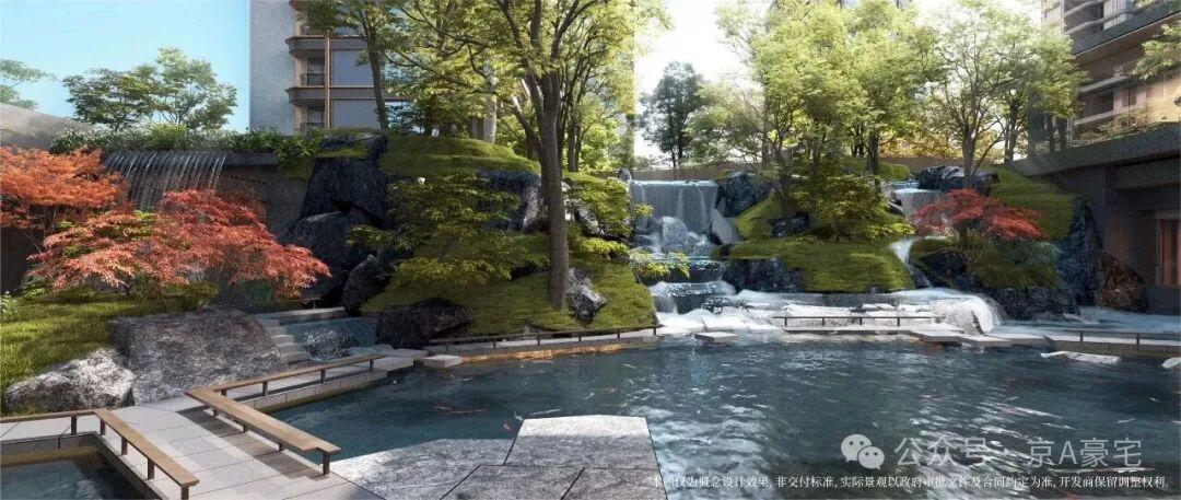 项目园林也是宋代美学园林,园林上山水林瀑,有湖有瀑有花径,走两步就是一幅画!