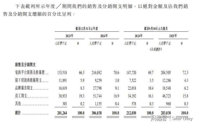 电商平台经销占比从2023年的31.0%到2024年的32.1%,截至2025年9月30日止9个月为30.1%;重点客户占比在2024年为7.1%,截至2025年9月30日止9个月为7.4%;经销商占比在2023年为17.6%,2024年为18.5%,截至2025年9月30日止9个月为20.4%。
