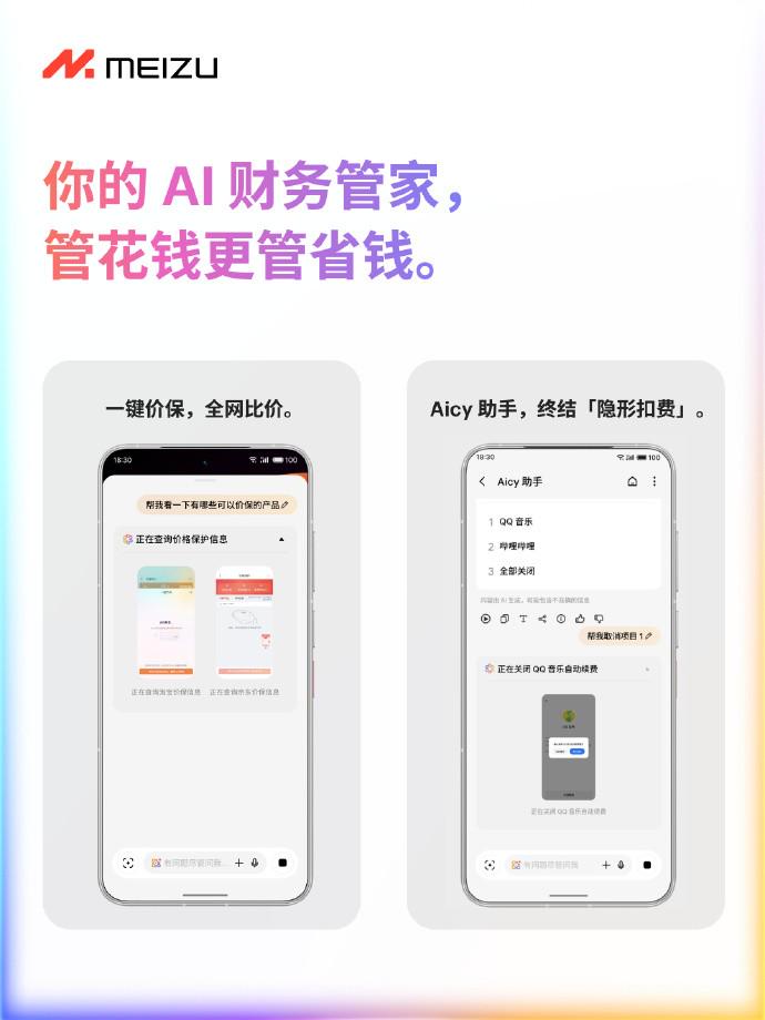 在移动支付普及的当下,“自动续费忘关”“买完就降价”成为不少用户的消费痛点。而魅族Flyme AIOS 2的Aicy助手升级,新增多项财务管理功能,以AI技术为核心,打造集“全网比价”“一键价保”“自动扣费标记”于一体的智能服务,为Flyme AIOS用户筑起钱包“防护盾”。