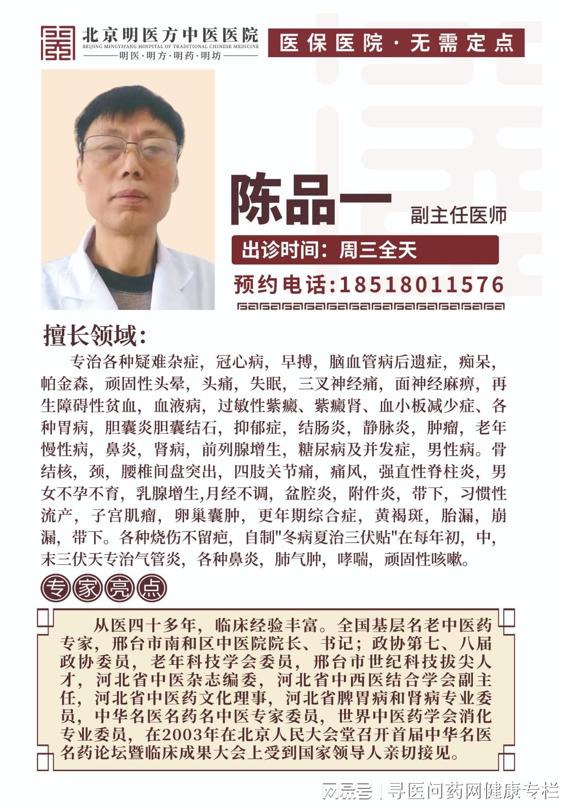 陈品一,临床工作四十余载,专注于中医临床与教学科研工作,学验俱丰。全国基层名老中医药专家,同时担任多项社会与学术职务:政协第七、八届政协委员,老年科技学会委员,邢台市世纪科技拔尖人才,河北省中医杂志编委,河北省中西医结合学会副主任,河北省中医药文化理事,河北省脾胃病和肾病专业委员,中华名医名药名中医专家委员,世界中医药学会消化专业委员,在2003年在北京人民大会堂召开首届中华名医名药论坛暨临床成果大会上受到国家领导人亲切接见。