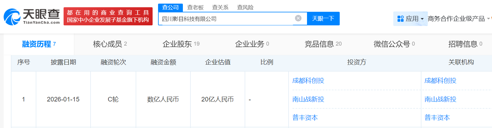 瑞财经 王敏1月15日,据天眼查,智能眼镜厂商四川影目科技有限公司(以下简称“影目INMO”)正式完成C1轮融资,本轮由成都科创投、南山战新投、普丰资本联合投资,公司估值达20亿。