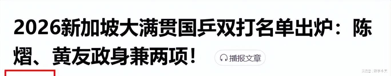 【1】2026年1月14日发布 咪咕赛事《2026新加坡大满贯国乒双打名单出炉:陈熠、黄友政身兼两项!》