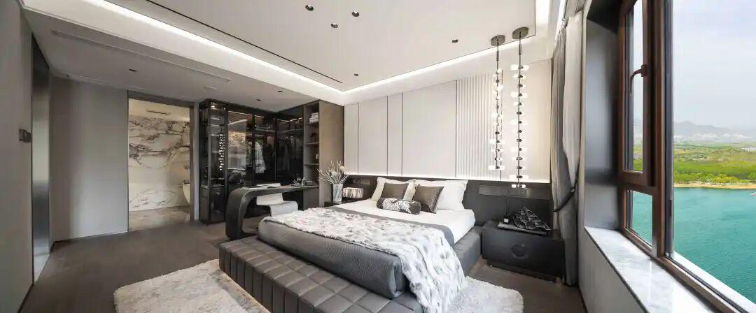 约7.5米南向横厅贯穿首层,充分引入青龙湖的自然光线,客厅与开放式中西厨联动,形成开阔的家庭互动空间,日常陪伴孩子玩耍或宴请亲友,都显从容气派。