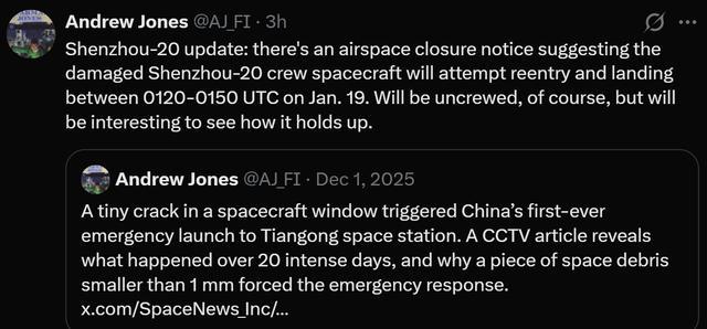 神舟二十号载人飞船的返回终于有新消息了!根据长期关注中国航天的国外知情人士安德鲁·琼斯(Andrew Jones)透露,东风着陆场的禁止航行通告(NOTAMS)已经发布了,在1月19日09:20到09:50,该区域的空域关闭,这意味着神舟二十号飞船预计将在这个时间段内着陆于东风着陆场。