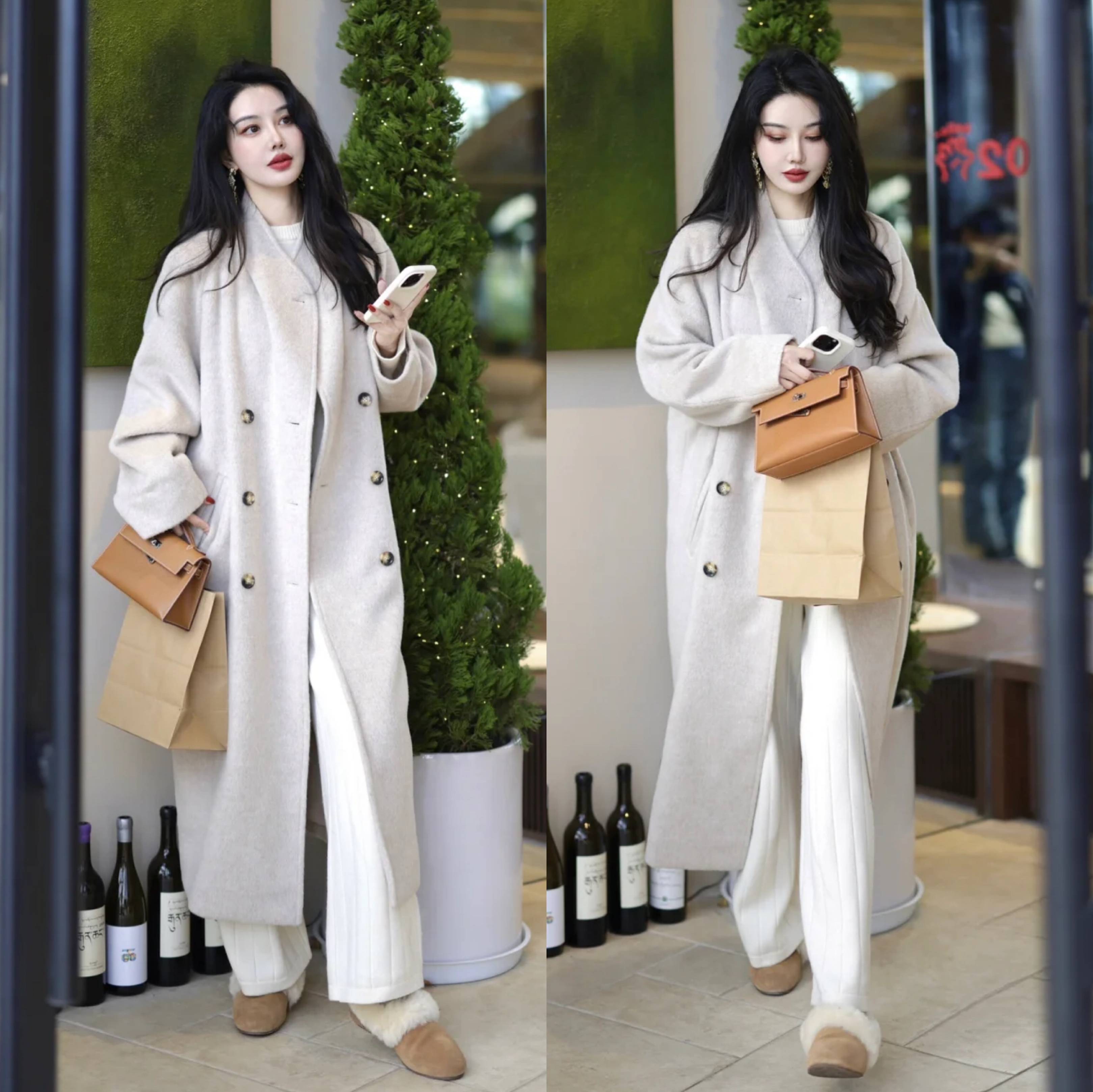 老钱风穿搭还要讲究松弛有度,大翻领设计的驼色大衣,内搭灰绿色高领打底衫,修身的版型,配合灰色高腰针织阔腿裤,非常舒适的配色和版型搭配,可谓是集优雅高级于一身。