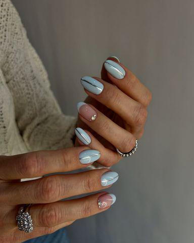 这种淡蓝色的美甲搭配漂浮的银色铬法式指尖,显得更加轻盈清新。每个无名指上的一点闪光,让这些指甲成为婚礼的可爱选择。