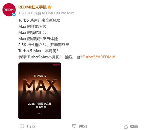 红米Turbo 5 max确定是本月发布,但具体哪天还没有官宣,目前跑分数据已经得到曝光,处理器会采用新的天玑9500s,GeekBench跑分库中单核成绩为2815分,多核成绩为9102分。
