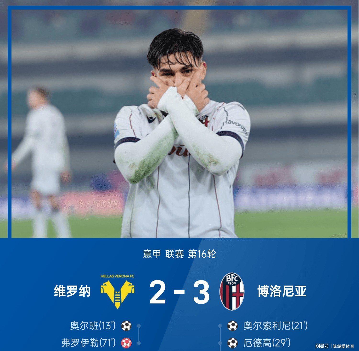 25/26赛季意甲联赛第16轮,博洛尼亚3-2战胜维罗纳。上半场比赛,奥尔班反击抽射破门,随后奥尔索利尼世界波扳平比分,厄德高抽射破门,卡斯特罗爆射得手扩大优势。下半场维罗纳发起进攻,弗罗伊勒自摆乌龙,但维罗纳没能扳回比分。