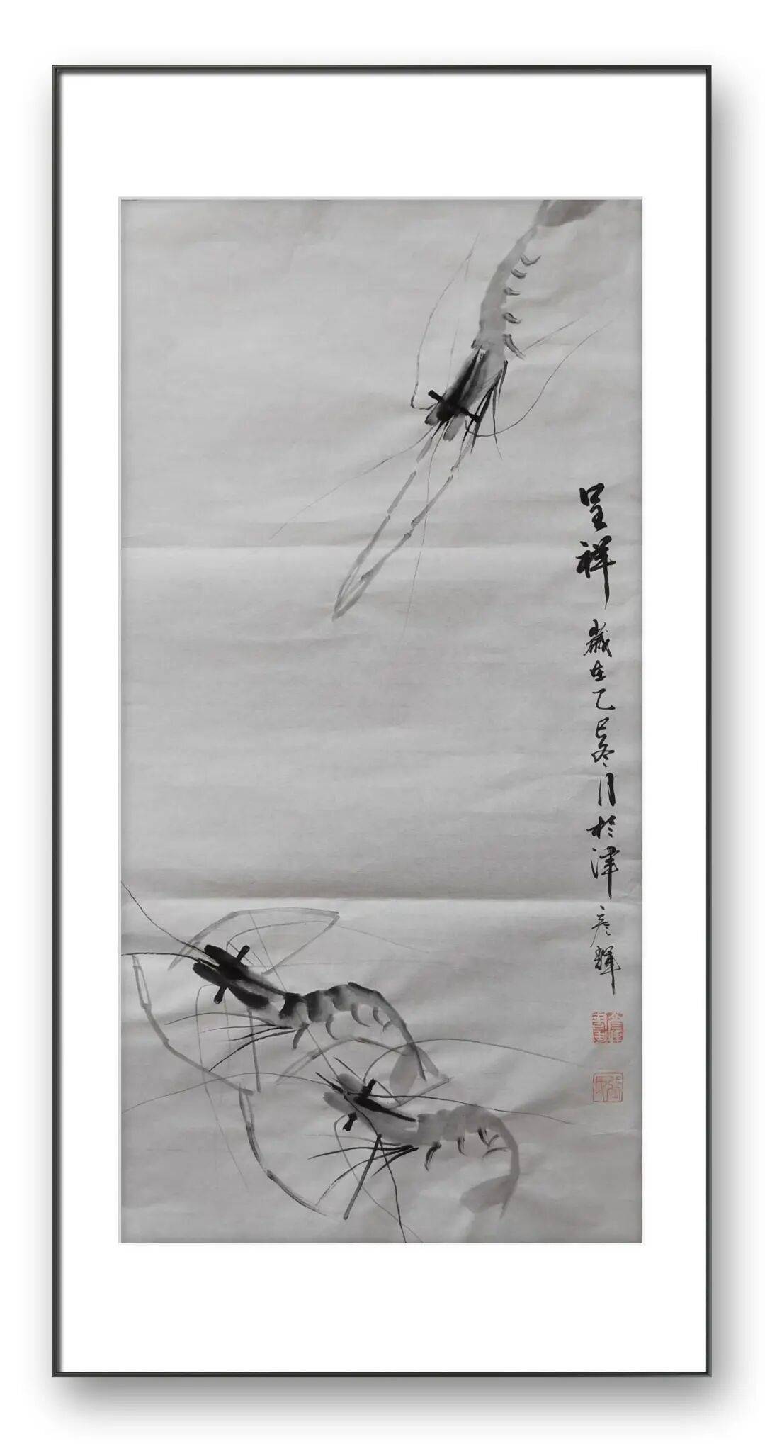 墨色在张彦辉先生的掌控下,如同被赋予了魔法。他以浓墨为剑,精准勾勒虾的关键部位,虾头的坚硬、虾钳的锋利,在浓墨的渲染下,仿佛能感受到虾的威严气势;又以淡墨为纱,轻轻晕染虾身,一层又一层,朦胧间营造出虾身通透如琉璃的质感,仿佛下一秒,虾就能从纸面跃入水中。画面中,虾群或聚或散,三两成群者,似在低声私语、追逐嬉戏;独自悠游者,又仿若在沉思冥想,享受独处的静谧。张彦辉先生凭借这种大胆创新的艺术融合,打破了传统书画的藩篱,让观者在墨香萦绕间,领略到虾的奇幻之美,触摸到艺术无尽的可能性边界。