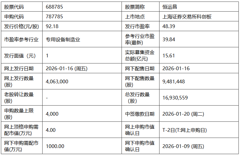 恒运昌2026年1月15日披露的上市发行公告显示,按本次发行价格92.18元/股和1,693.0559万股的新股发行数量计算,若本次发行成功,预计公司募集资金总额156,065.89万元,扣除发行费用(不含增值税)14,690.13万元,预计募集资金净额为141,375.76万元(如有尾数差异,为四舍五入所致)。