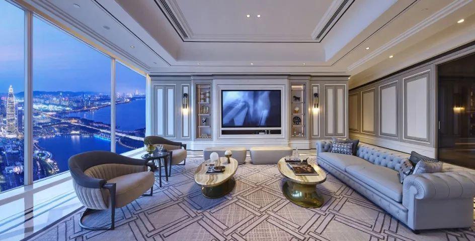 户型设计上,天玺充分体现了“以尺度重构生活”的理念。以约405㎡四房户型为例,南向开间超过17米,实现真正意义上的“宽幕级采光”,客厅、餐厅、厨房一体化贯通,形成近70㎡的超级会客空间,可轻松容纳20人以上的家庭聚会或商务接待。主卧套房配备独立衣帽间与双台盆卫浴,部分户型更设有观景阳台,实现室内外景观的无缝衔接。全屋层高达3.6米,远超常规住宅标准,配合无梁设计与隐藏式吊顶,让空间显得更加通透开阔。每一个转角、每一扇窗的位置都经过精心推敲,力求最大化利用景观资源与自然光线。