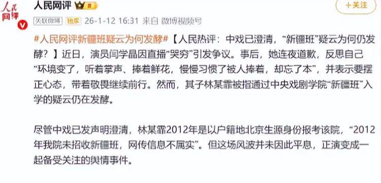 如果说“哭穷”只是让人设崩塌,那么接下来的“中戏新疆班”事件则让闫学晶陷入了更深的信任危机。1月10日,有博主发布实名举报视频,质疑闫学晶儿子林傲霏当年凭借“新疆班”渠道进入中央戏剧学院的合规性。