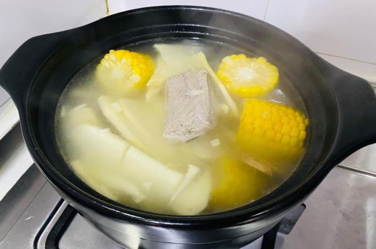 5、一个半小时后,冬笋以及玉米都放到砂锅中,同排骨炖煮,半小时后关火,调些盐,香葱就做好了。