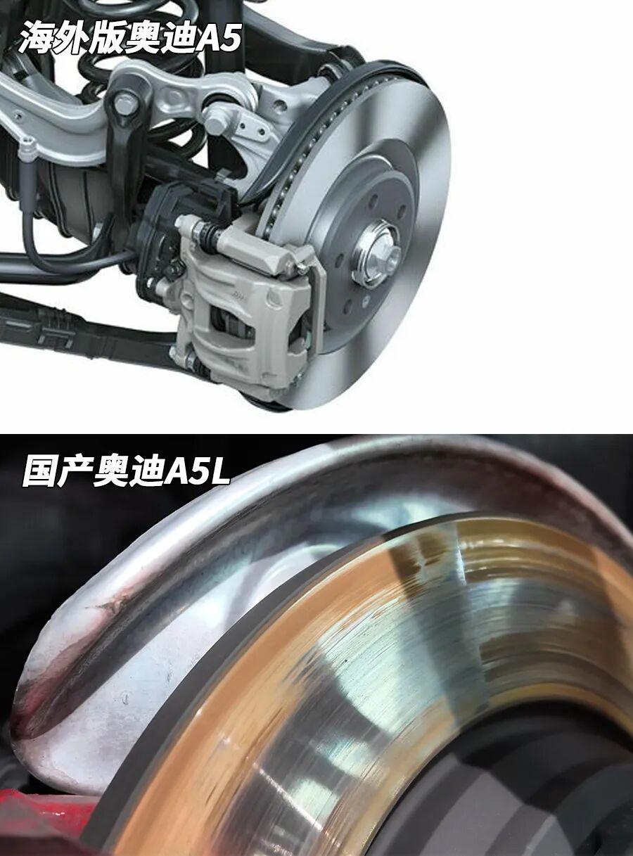 此外,这辆四驱版本的奥迪A5L的前刹车是通风盘,而后轮刹车盘竟然是实心盘,不是通风盘。有意思的是海外版奥迪A5四驱版的后轮刹车是通风盘!这里的道道儿,就不用多说了。