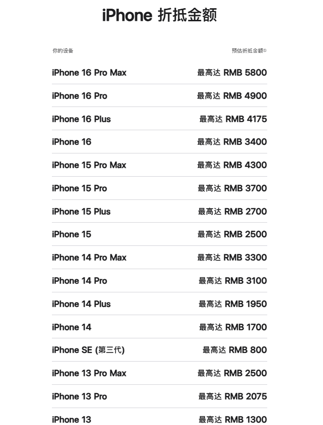 iPhone系列中,iPhone 16 Pro Max最高可享5800元折抵优惠,iPhone 16 Pro折抵价达4900元,iPhone 16 Plus为4175元,iPhone 16基础版也可抵3400元;前代旗舰iPhone 15 Pro Max折抵价维持4300元,iPhone 14 Pro Max仍可抵3300元,老款机型如iPhone 11系列最低也能享受700元折抵。平板与电脑端,iPad Pro最高可抵5800元,Mac Pro折抵价高达17100元,Mac Studio也能享受12150元抵扣,Apple Watch Ultra 2折抵价则为1850元。