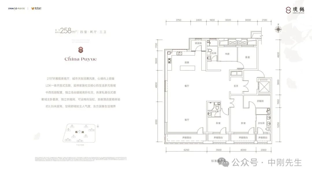 约15.4米南向四面宽,双套房布局,餐客一体,边厅270°超凡视野,主卧面宽约5.8米,主卫南向浴缸,星级酒店礼遇,灵动书房可随心变换功能,随需承载高阶生活理想,私人藏品级生活展场