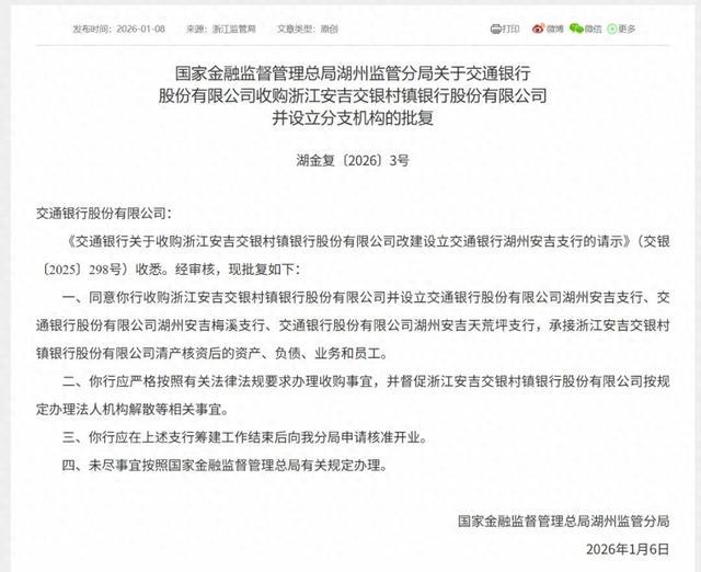 1月6日,金融监管总局湖州监管分局下发批复,同意交通银行收购浙江安吉交银村镇银行,并设立交行湖州安吉支行、交行湖州安吉梅溪支行、交行湖州安吉天荒坪支行,承接浙江安吉交银村镇银行清产核资后的资产、负债、业务和员工。