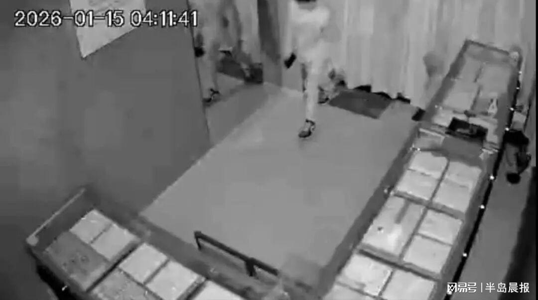 紧接着,该账号发布第二段视频,该视频为店内监控录像,时间显示从1月15日凌晨3时45分许持续到4时40分许,记录了一名年轻白衣男子砸门进入店内洗劫饰品柜台的全过程,期间,该男子还曾大幅度推动一侧柜台,将一只疑似保险柜的物件推出店外。这一过程中,另一身着深色衣服的男子还将一辆电动车骑进店内。最后,透过金店玻璃门一角可看到,盗窃男子疑似骑乘一辆电动车离开。