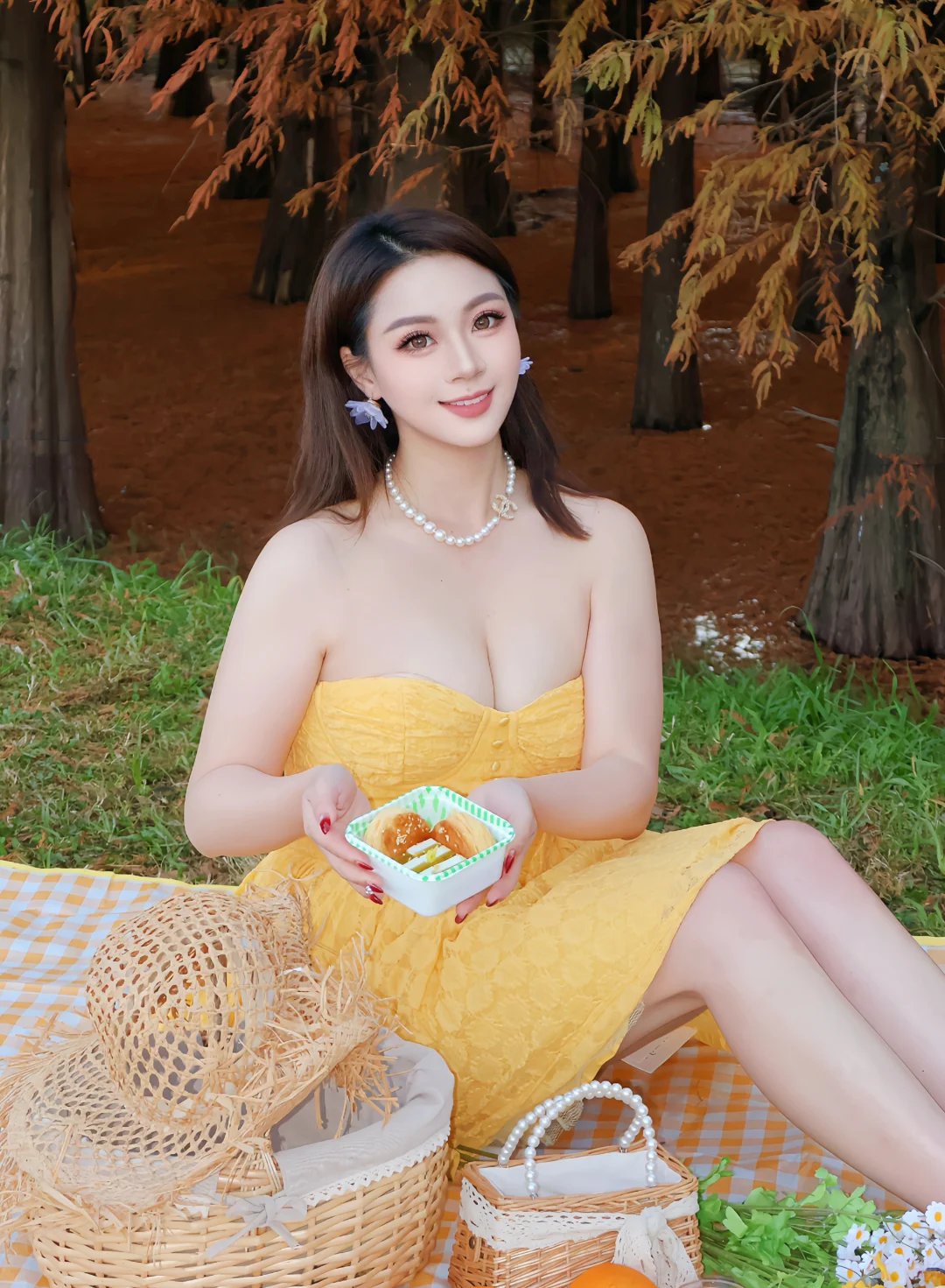 别的小仙女拎着帆布包、塞着一次性餐盒冲去草地时,我——穿鹅黄色吊带裙、白皮肤在阳光下晃眼的御姐,正优雅地指挥外卖小哥把保温箱扛到草坪最平整的角落。野餐?不,这是我临时在户外开的“限定酒楼”。
